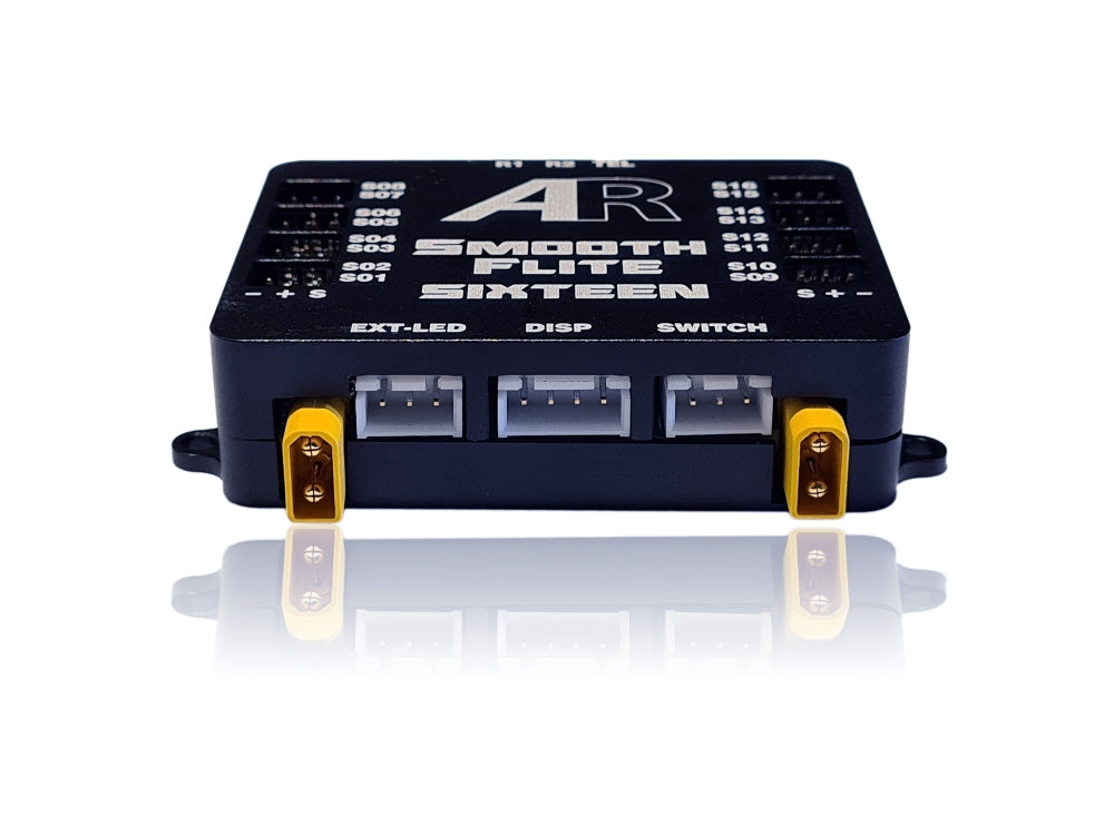 Looking at that next big project and wondering how you’re going to power all those servos, the Smooth Flite system is equipped with 16 fully programmable outputs, all via a single cable connected to your receiver. Each channel is freely assignable to any input and can be reversed and matched to any other channel on the Smooth Flite. Building that next giant scale model Smooth Flite has got it covered.