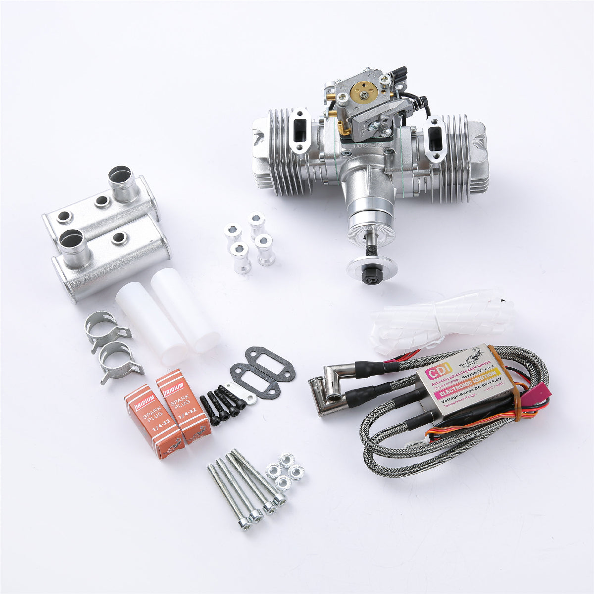 - RCGF Stinger Engine package Includes: electronic CDI ignition, muffler, spark plug, gaskets, bolts, throttle arm extension & manual.